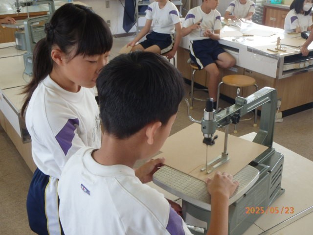 1時間目、2年生の教室に怪しい振動音が聞こえてきました。(今日は工事はないはず。まさか、何か校舎に異変が起こっているのか?)とその音をたどっていくと、ちょうど上の教室で、5年生が電動糸のこを使って工作をしていました。糸のこを慎重に扱いながら、思い思いの形をくりぬいています。
