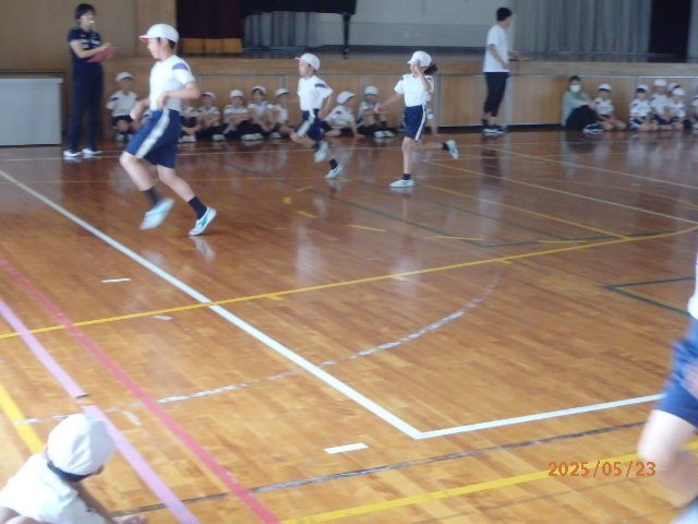 その後の休み時間、階段ですれちがった5年生に、「次は何の時間?」と聞くと、2年生と一緒に体育でシャトルランテストをするとのこと。2時間目に体育館に行ってみると、5年生を目標に、2年生もシャトルランに頑張っていました。