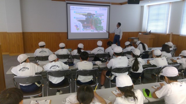 まずは、早明浦ダムに到着して、早明浦ダムの仕組みについて学んでいます。メモを取りながら静かに話を聞くことができています。