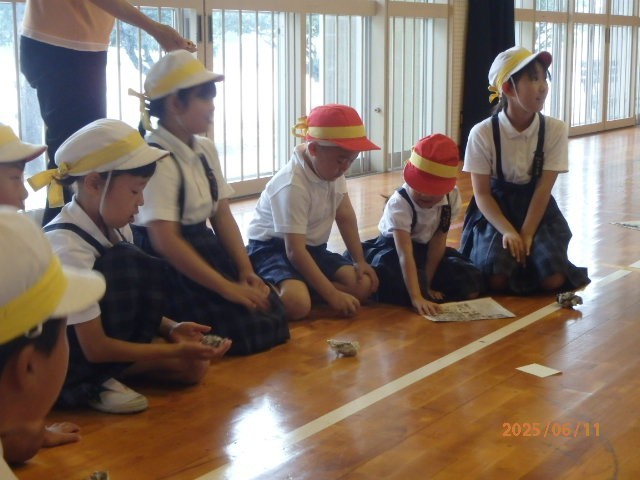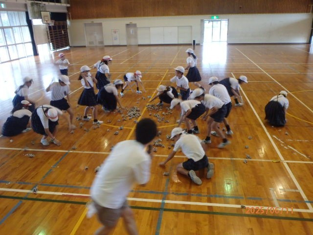 にぎにぎ競争が終わり、1~5年生が体育館を去った後、6年生が、その新聞紙ボールを使ってゲームを楽しみました。2チームに分かれて、時間内に相手の陣地に多く新聞紙を投げ入れた方が勝ち、というゲームです。再利用された新聞が、さらに活用されました。