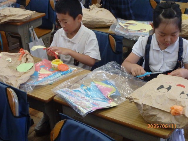 その後、職員室に戻っていると、2年生が「くしゃくしゃぎゅっ」を作っていました。紙袋の中に新聞紙を詰めて作ったアートです。この作品については金曜日の授業参観の折にご覧いただけるかと思います。