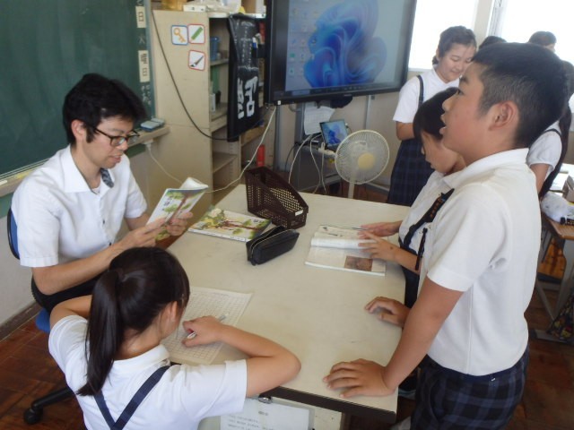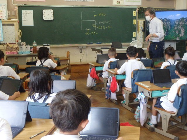 同じころ、1年生の教室では、(おそらく初めて)タブレットパソコンの使い方の授業をしていました。「ここが“スペースキー”」「ここが“エンターキー”」と基礎の基礎からスタートです。