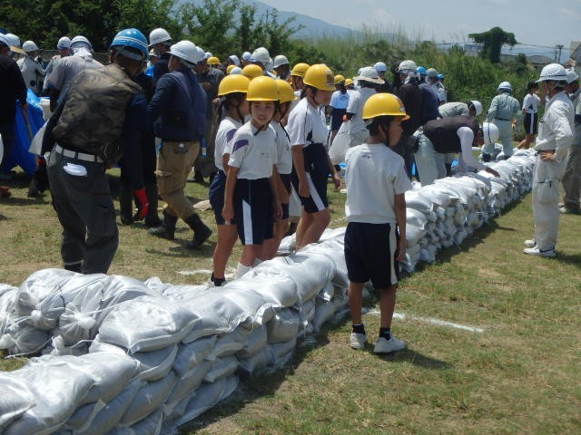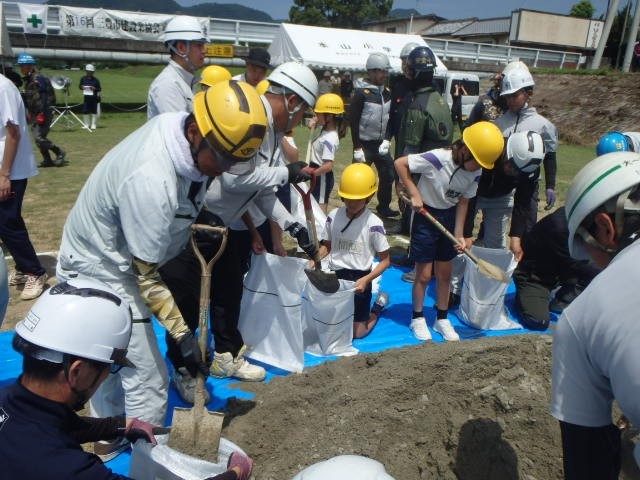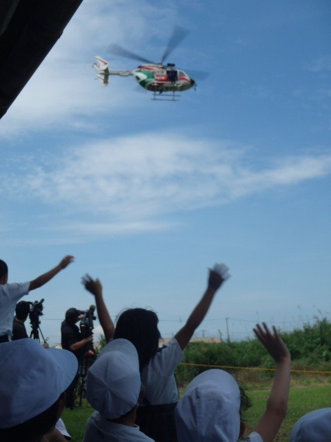 ダンプカーから降ろされた土砂を使っての土のう設置訓練。ヘリコプターを使っての降下救助訓練。学校で行う防災訓練とは一つ一つの訓練の規模が違います。真剣な大人の姿と、「おっ、スコップ使うの、うまいやないか」と褒めてくれる優しさと。地域を支えてくれている強さとあたたかさを感じました。
