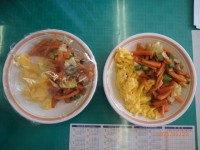 4時間目に、6年生が野菜炒めとスクランブルエッグを届けてくれました。今日の家庭...