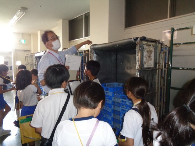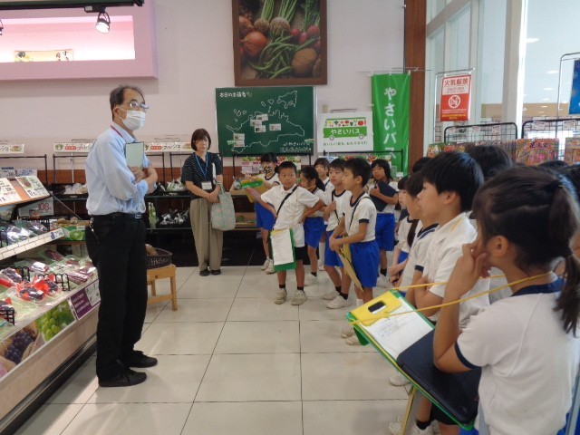 社会科の「店ではたらく人」の学習で、マルナカ豊中店に見学に行きました。副店長さんから丁寧な説明を受けながら、店内をバックヤードまで見せていただきました。大きな冷蔵庫や冷凍庫にも入らせてくださって、その大きさや冷たさにびっくりしました。お客さんが気持ちよく買い物をして、喜んでくれるように、安全な商品を届けられるようにと様々な工夫や気づかいをしていることを学びました。