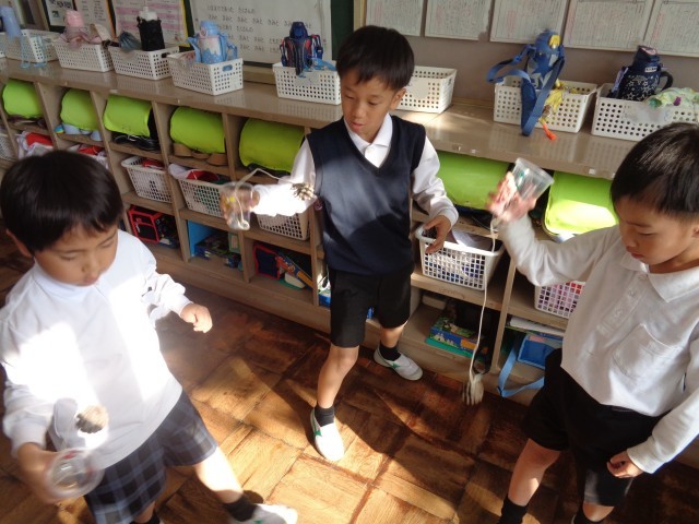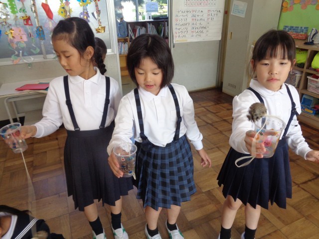 たこ糸をカップに通したり、糸を結んだりするのが難しかったのですが、みんなうまく作れました。マジックやシールですてきな模様を作り、オリジナルけん玉の完成です。