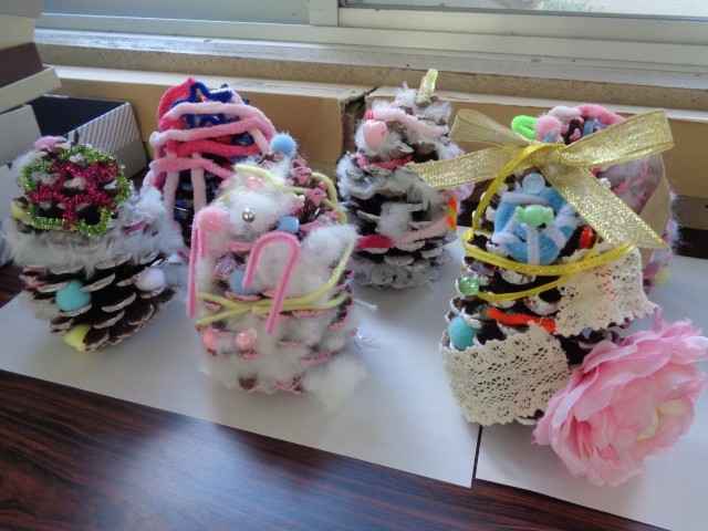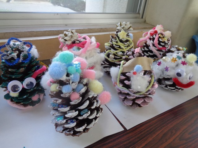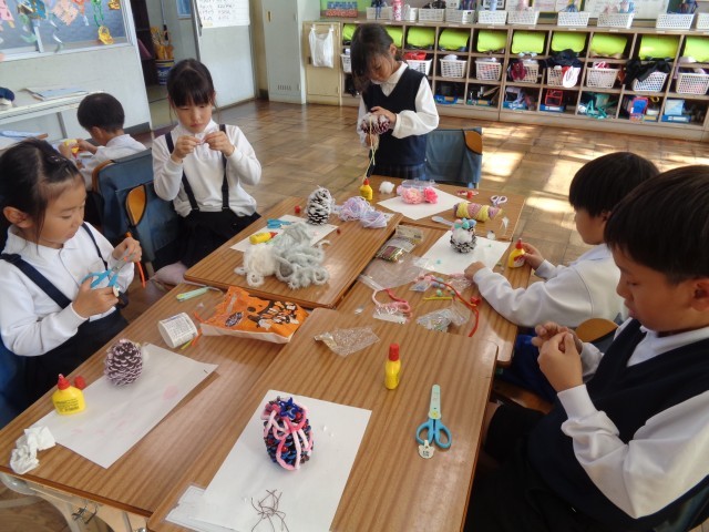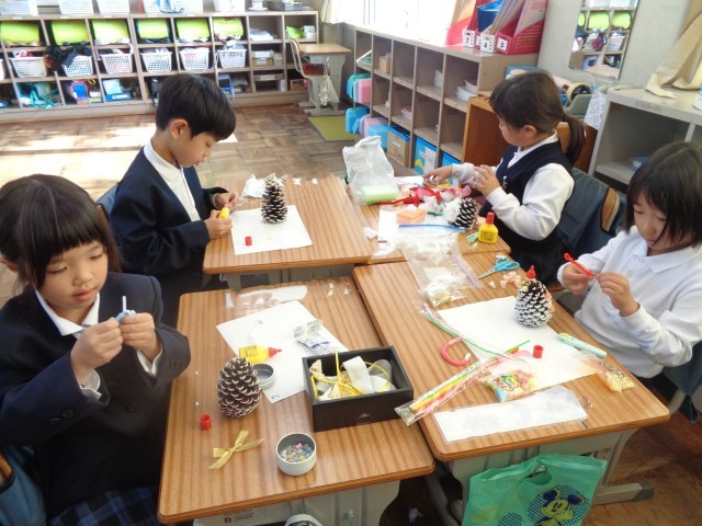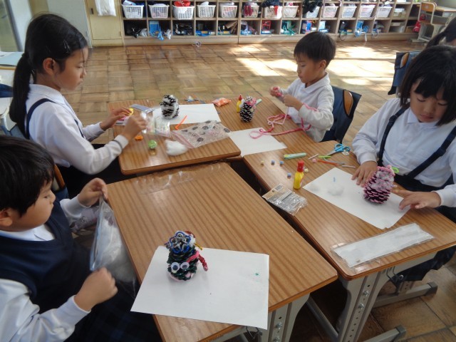 生活科の時間に、まつぼっくりツリーを作りました。先週、絵の具で色付けしたまつぼっくりに、飾りつけをしました。みんなの創作意欲が止まらない!想像以上にデコられたまつぼっくり!こんなにおしゃれになって、まつぼっくりもびっくりしていることでしょう(笑)