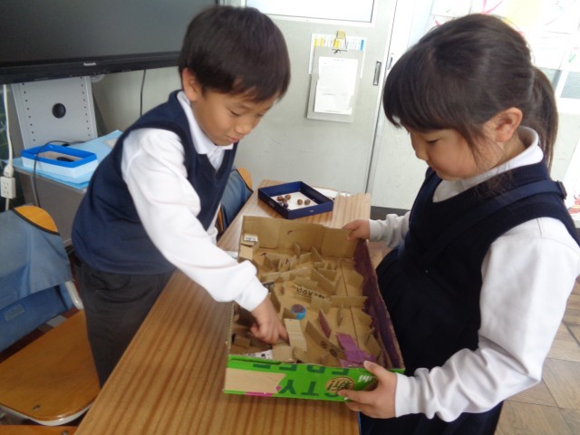 冬になってしまいましたが、秋の木の実を使った秋のおもちゃランドを開きました。お店は全部で5つ。どんぐりつかみコーナー・どんぐり迷路コーナー・どんぐりくじ引きコーナー・どんぐりアクセサリーコーナー・どんぐりボウリングコーナー。