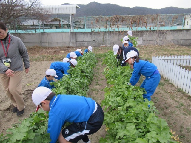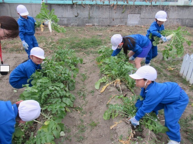 2学期に種まきをした大根が立派に大きくなり、先日収穫しました。持って帰った大根は、おうちでいろいろなメニューに変身したようですね。学校では、ポトフにしておいしくいただきました。甘い部分もあれば、少し辛い部分もあったようですが、5本分の大根をみんなでペロリと完食しました。