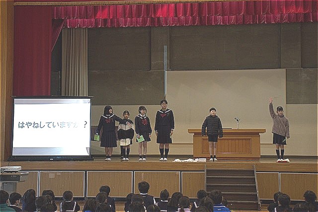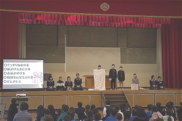 寒さに負けない体を作るために、「早ね」について保健委員会が全校朝会で発表しました。