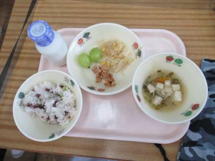 給食 公開日 2021/09/14 更新日 2021/09/14 学校全体 9月14日(火) 今日の給食のメニューは、「はぎごはん、すましじる、オリーブ地鶏の唐揚げ、切り干し大根のあまず、シャインマスカット、牛乳」でした。大きくてとても甘かったシャインマスカットは豊中町産だそうです。オリーブ地鶏も香川産かなと思いました。