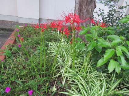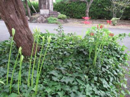 彼岸花 公開日 2021/09/16 更新日 2021/09/16 学校全体 今年の彼岸の入りは9月20日(月)だそうです。中日(秋分の日)は、9月23日(木)です。彼岸花が毎年、彼岸の頃に咲くことには自然の不思議さを感じます。比地大小学校の植え込みにも、彼岸花が咲きだしています。ちょうど伸びた花径とつぼみと花という3つの段階が一つの植え込みにあるのがいいなと思って撮った写真もあります。