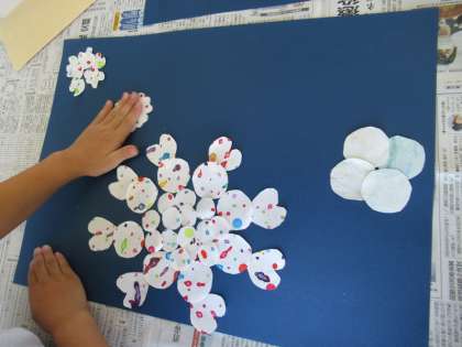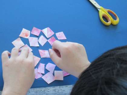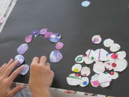 図工の時間、4年生は、様々な技法で花びらを作ってきました。今日は、それを画用紙に花の形にはっていきました。写真は、花びらを置いて、レイアウトを確かめているところです。