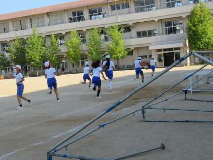 昨日の委員会活動は運動会の準備でした。外で活動した委員会が運動場のサッカーゴールを片づけたり、テントの積み立てをしたりしました。朝礼台も設置され、ちょっと運動会の雰囲気になった運動場で、1時間目に5、6年生がリレー練習をしました。