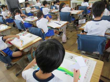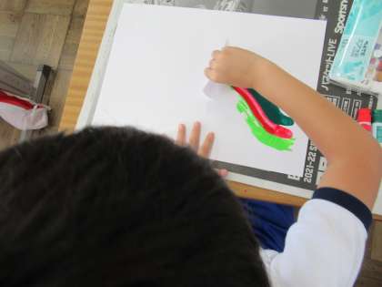 絵の具を直接画用紙にのせて、紙を使って引いて長く伸ばして絵を描くというおもしろい絵画作品作りを2年生がしていました。すっと伸ばしたり、くねくねとさせたりして、味わいのある作品ができていました。