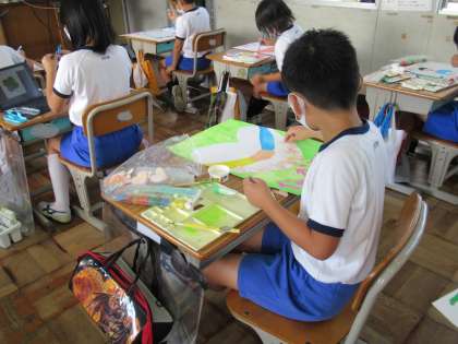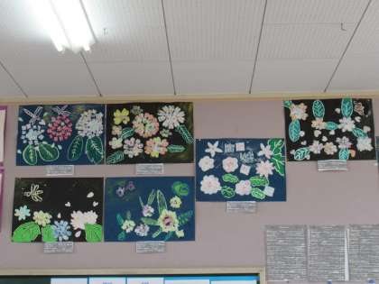 掲示されている作品と次の作品作り(4年生) 公開日 2021/10/14 更新日 2021/10/14 学校全体 10月14日(木) 作品「幻の花と昆虫」が掲示されていましたので一部を紹介しています。また、4年生は次の作品作りにも取り掛かっていました。