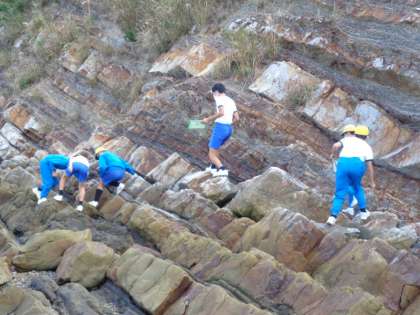 地層見学(6年生) 公開日 2021/10/15 更新日 2021/10/15 学校全体 10月15日(金) 6年生は、理科の校外学習で余木崎海岸に行き、地層を観察しました。砂岩やでい岩が積み重なっている様子を実際に見て学びました。