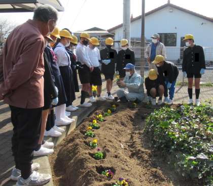 6年生が、長寿会の方と一緒に、比地大駅前の花壇に、パンジーの苗を植えました。とてもたくさんの苗を6年生は協力し合ってあっという前に植え終わり、長寿会の方々も驚かれていました。