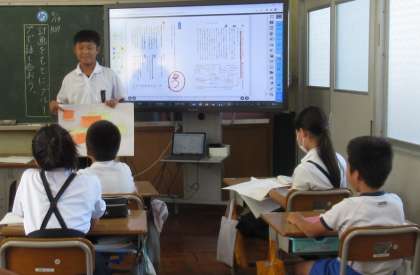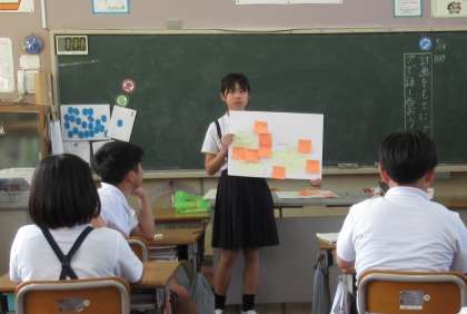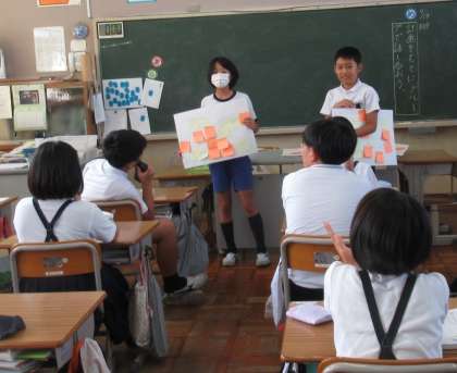 国語の「問題を解決するために話し合おう」の学習では、身の回りの問題について、よりよい解決方法を考える学習をしています。子どもたちはグループに分かれて、「図書室の利用を増やすためには…」「進んであいさつができるようにするためには…」「次の時間の準備をして休むには…」どうすればよいかについて、考えました。どのグループも、(1)問題を確かめる(2)問題の原因を考える(3)解決するために取り組む方法を考える(4)話し合いをまとめるという計画で、話し合いを進めました。グループで協力して、出てきた意見を付箋に書き出し、並べ、整理しながら話し合いを進め、よりよい解決方法を考えることができました。