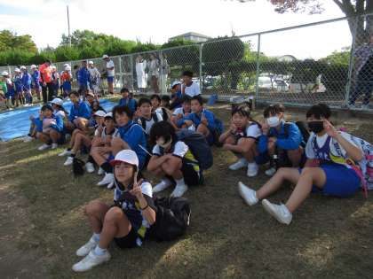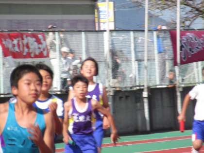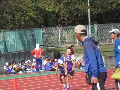 観音寺総合運動公園の陸上競技場で、陸上記録会が開催されました。選手の子どもたちは、それぞれ80メートルハードル、100メートル走、走り高跳び、走り幅跳び、ジャベリックボール投げ、4×100メートルリレーに出場しました。みんな、これまで練習してきたことをしっかり発揮しようと、一生懸命がんばっていました。また、応援フィールドでは、がんばっている友だちに届くように、元気いっぱいの温かい声援を送っていました。