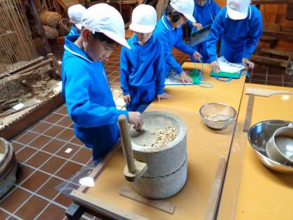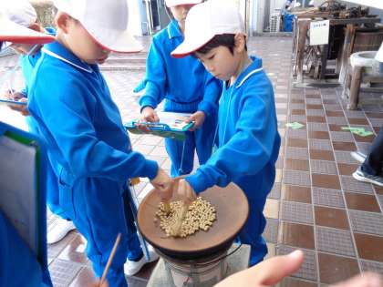 詫間の民俗資料館で昔の道具を体験してきました。火起こし体験や洗濯などたくさんの体験をすることができました。火起こし体験では、苦労しながらも、グループで力を合わせて火をつけることに成功しました。現代のボタン一つで火をつけることができる便利さにも気付くことができました。活動の最後に、自分たちで作ったきなこを振りかけたおにぎりを食べることができ、子どもたちはおいしく味わって食べていました。