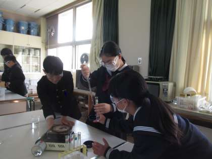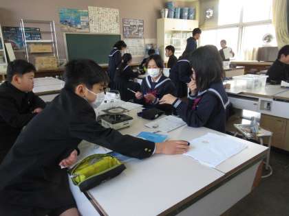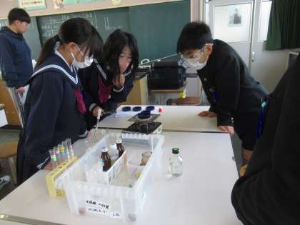 水に溶けている物に着目して、それらによる水溶液の性質や働きの違いを調べる活動を通して、水溶液の性質や働きについての理解を深める学習をしています。子どもたちは、班で協力して、安全に気を付けて実験をしていました。