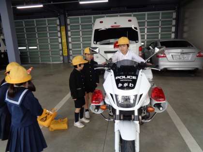 校外学習で消防署と警察署の見学を行いました。消防署では、防火服を着用させてもらったり、消防車に積んである道具を見せてもらったりしました。警察署では、パトカーや白バイクに乗せてもらいました。最後には、気になっていた質問にたくさん答えてもらうことができました。
