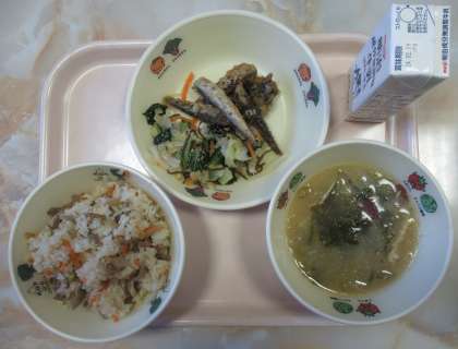 1月25日(木)の給食は…肉もっそ 牛乳 小いわしの南蛮漬け 野菜の昆布あえ さつまいものみそ汁 です。