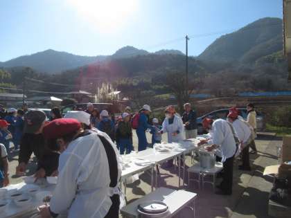 2月17日(土)に、七宝山に登りました。登山口で、山の会会長さんのお話をお聞きして、入念に準備体操を行い、早速登り始めました。山頂のつず(標高449m)は、七宝山山系の最高地点だそうです。天候にも恵まれ、山頂からの景色は素晴らしかったです。今年は、つずから尾根を歩いてパラグライダー場まで行き、お弁当をいただきました。広いパラグライダー場でたくさん遊んで、子どもたちは元気に宮池自治会場まで下りてきました。自治会場では、婦人会の方々が、やわらかいおもちがたくさん入ったぜんざいを炊いて待っていてくださり、美味しくいただきました。ご協力いただきました山の会、婦人会の皆様、PTA役員さん、保護者の皆様、どうもありがとうございました。
