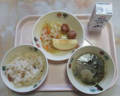 3月18日(月)の給食は…中華おこわ 牛乳 揚げしゅうまい キャベツの甘酢あえ わかめスープ りんご でした。