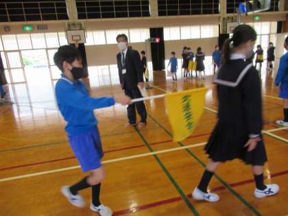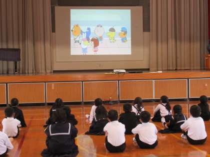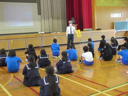 警察署の方や交通指導員の方、グリーンパトロールの方が来られ、交通安全教室をしました。密を避けるため予定を変更し、5時間目に1年生、6時間目に5、6年生のみで実施しました。市役所の方が、信号機を持ってきてくださり、1年生は歩き方や渡り方を、5、6年生は、班旗を使っての渡り方を練習しました。練習の後は、DVDを見ました。