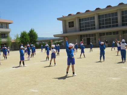 4月26日(月) 3、4年生のダンス練習。片手をあげたポーズ!しっかり覚えられています。