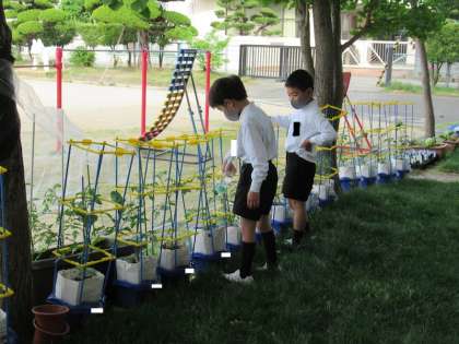 2年生が、朝、ミニトマトに水をやっていました。大事に育てて、たくさんミニトマトが収穫できるといいですね。