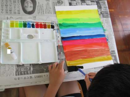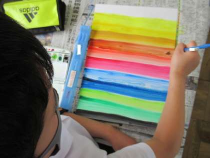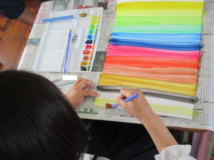 4年生は、絵の具できれいなにじ色を塗っていました。大きな作品の部分となるそうです。どんな作品なのでしょうか。楽しみです。