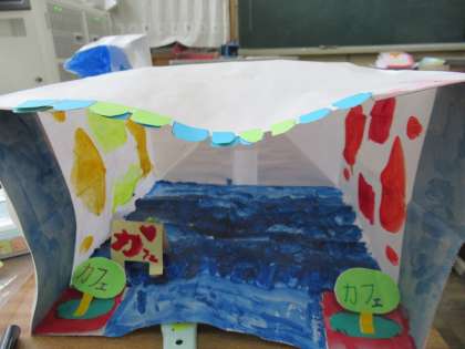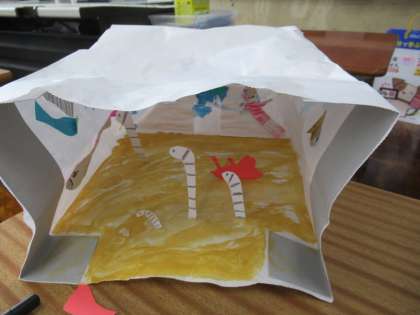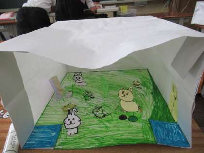 3年生の図工の時間です。紙袋の中に、思い思いの世界をつくっていました。のぞいてみると、とても楽しいです。