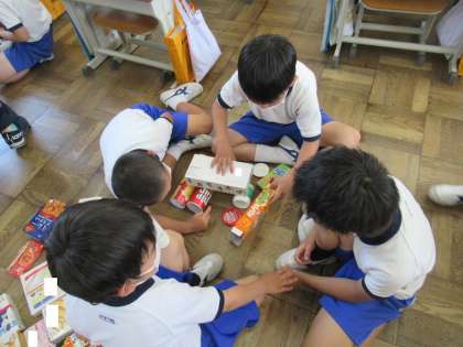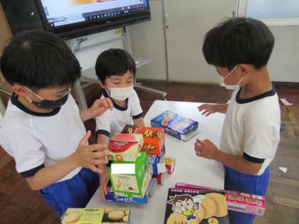 箱の形で(1年生) 公開日 2021/06/01 更新日 2021/06/01 学校全体 6月1日(火) 算数の時間、持たせてくださったいろいろな空き箱を使って、友だちと作品作りを楽しみました。形や大きさなどを生かそうと、工夫していました。