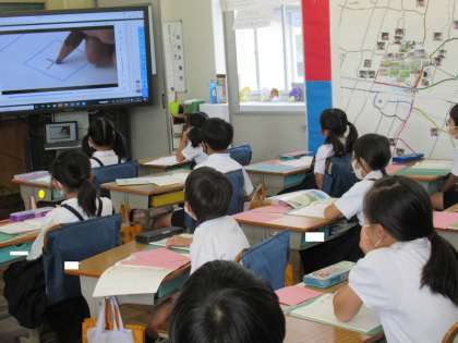6月1日(火) 書写の時間です。点画の書き方や名前を、映像で確かめているところです。