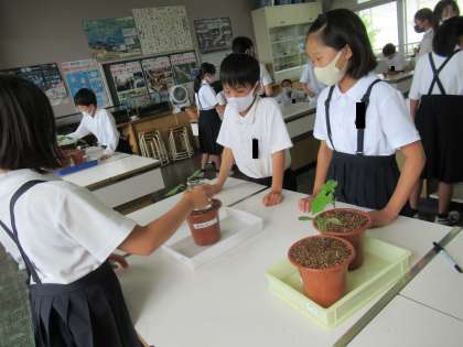3時間目(5年生) 公開日 2021/06/04 更新日 2021/06/04 学校全体 6月4日(金) 5年生は、理科で、「植物が発芽した後、大きく成長していくには何が必要か」というめあてでの学習です。肥料と日光があるのとないのとで比べていくため、肥料をやるなどをグループごとにしていました。