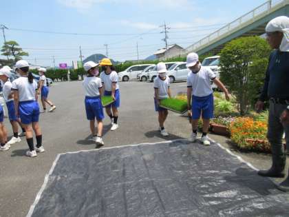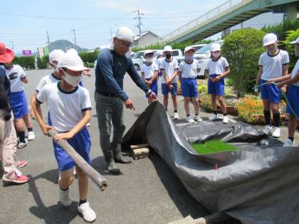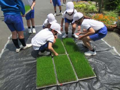 5月28日にもみまきをした稲の苗が届きました。お世話をしてくださっていた方と一緒に、学校で育てるための準備をしました。これからは5年生が成長を見守りながら、世話をがんばります。