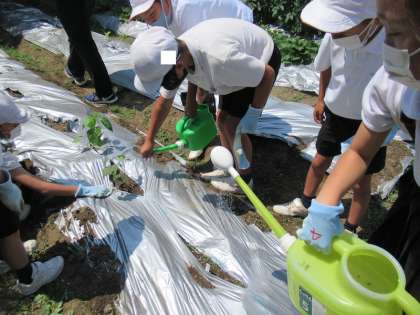 畑に(3年生) 公開日 2021/06/09 更新日 2021/06/09 学校全体 6月9日(水) 3年生が、育てていたピーマン、オクラ、ひまわりの苗を畑に植えていました。植えたり、マルチを土で押さえたり、水をやったり、分担して協力し合っていました。
