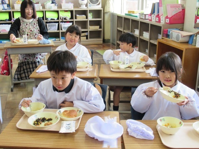 16日から1年生も給食が始まりました。小学校での初めての給食でしたが、全員が時間内に食べられました。