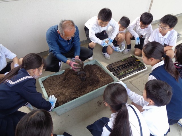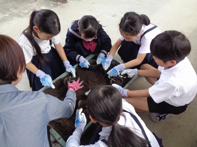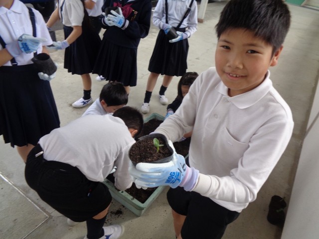 そして理科では、ヘチマの植え替えをしました。小さな芽が出たばかりのヘチマは、まるで赤ちゃんのよう。やさしく土をかぶせることに気をつけながら、大切に大切に植え替えをしました。一人ひとりがていねいに作業している様子がとてもほほえましかったです。