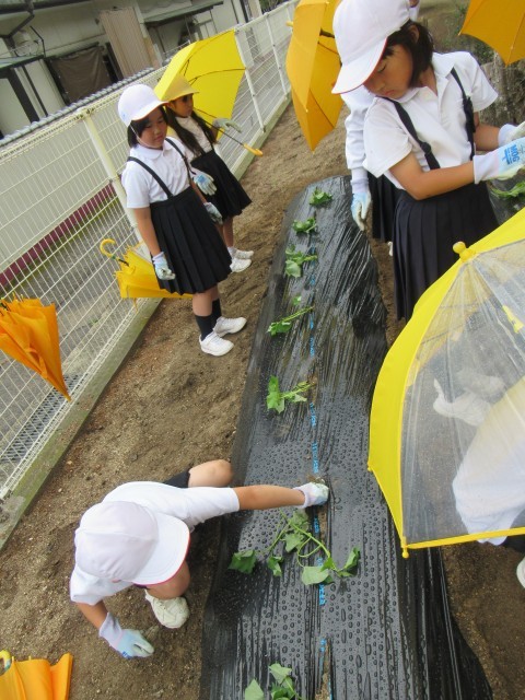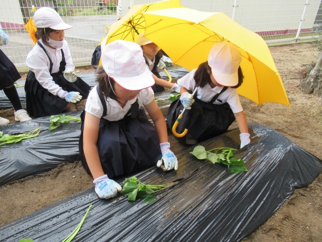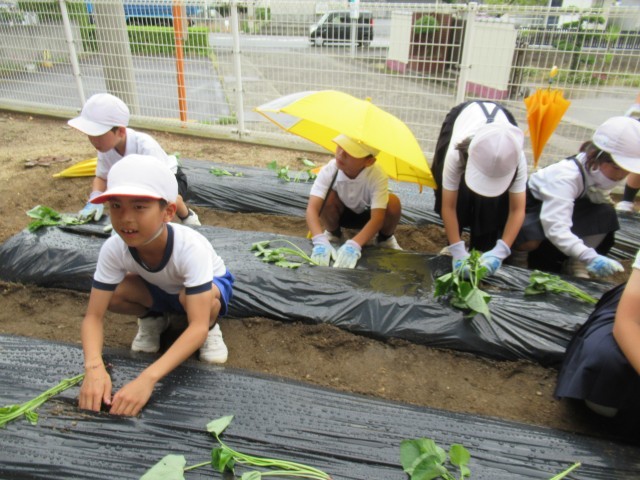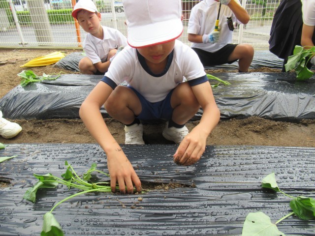 小雨の降る中、体育館裏に今年新しくできた「いも畑」につるをさしました。