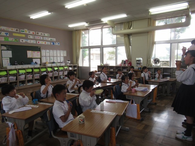 今日は、歯磨き強調週間の1日目です。給食後の歯磨きの時間に、保健委員さんが、各学級に来て、一緒に歯磨きをしてくれました。1年生の教室では、養護の先生や保健委員さんの歯磨きのお手本をよく見て、みんなとても丁寧に歯を磨くことができていました。歯と口の健康を守るために、毎日、続けたいですね。
