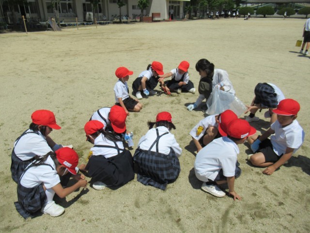 1年生は、担任の先生と一緒に運動場の草抜きをしました。
