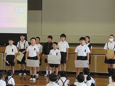 全校朝会で、放送・給食委員会から、手洗いの大切さについて、クイズ形式でお知らせがありました。お知らせを聞いていた子どもたちの中から「楽しくて、わかりやすい内容だった。」という感想が聞かれました。6月4日から10日まで、委員会の子どもたちが、全校生の給食前の手洗いが丁寧にできたかどうかのチェックをするそうです。食中毒等の予防のためにも、丁寧に手を洗いたいですね。