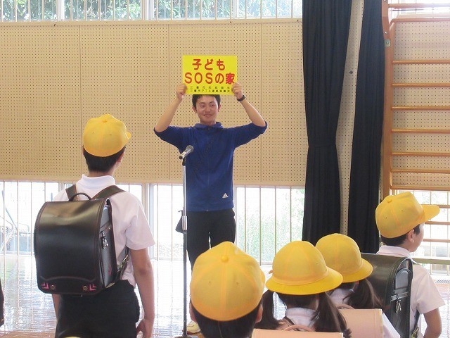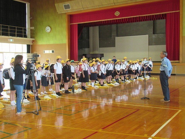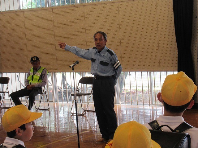 交通指導員さんからは、横断歩道や信号機のない交差点では、一旦停止と左右確認をすること、不審だなと思う人に会ったら、登下校ボランティアの方や子供SOSの家に助けを求めることをお話しいただきました。