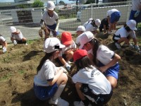 昼休みに、「ちょボラ」として、サツマイモを収穫しました。土をどんどん掘っていくと...
