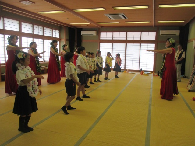 7月14日(月)に、2年生は生活科の町探検で、公民館に行きました。公民館に行くと、館長さんが丁寧に説明をしてくださったり、質問に答えてくださったりしました。また、カサブランカのみなさんが、すてきなレイや髪飾りをつけてくださって、ダンスのレッスンをしてくださりました。子どもたちは普段、学童などで使う身近な場所ですが、新しい発見もあり、とても楽しく学ぶことができました。