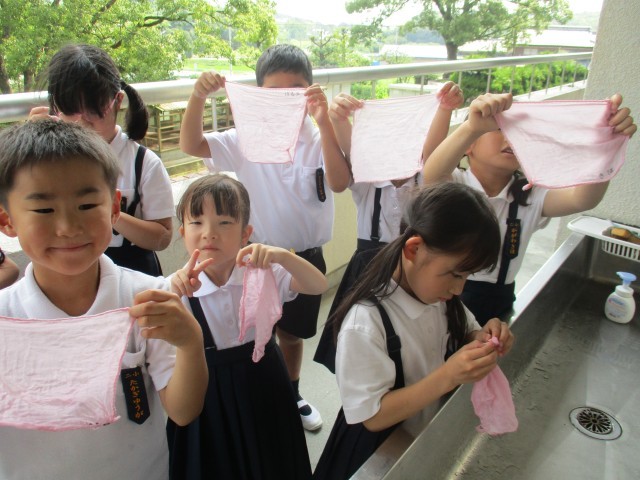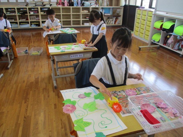 5月に種をまいたアサガオがたくさんの花を咲かせています。きれいに咲いた花で、色水を作り、ハンカチをアサガオ色に染めたり、花のこすり出しでアサガオの花を画用紙一面に咲かせたりして遊びました。いろいろな体験を通して、自然の不思議さや美しさを感じることができました。夏休みも大切に育てて、たくさんのアサガオの種を取ってほしいと思います。